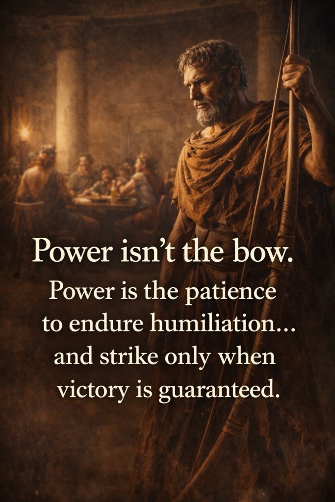 Instead of striking, Odysseus studies the room carefully. He counts the men, watches their habits, and quietly observes which servants remain loyal and which have betrayed him. The hero of the Odyssey does something most people cannot do, which is delay revenge until the moment is right.