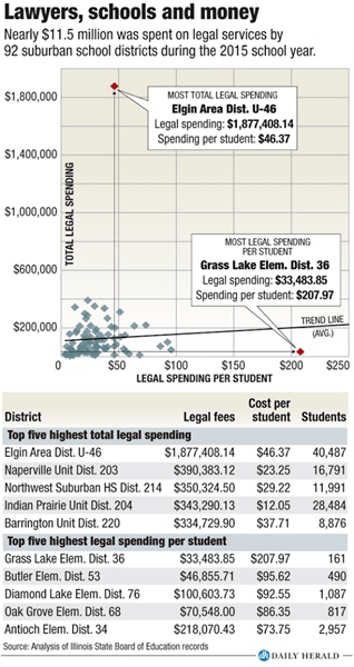 Most school districts don’t have attorneys come to every board meeting. Gurnee Elementary District 56 Superintendent John Hutton said the $16,936 — or $8.03 per student — the district spent on legal work in 2015 was more than he would have liked, noting that school districts are often billed for the time it takes a lawyer to drive from the law office to the district.