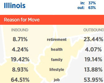 United Van Lines reports that Illinois is Number 2 is the ratio of people moving out versus those moving in. 63% of the loads are leaving Illinois.
