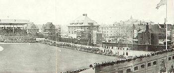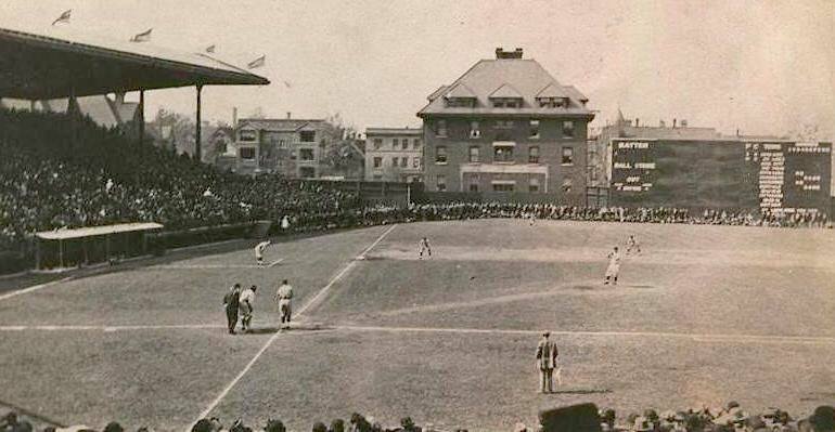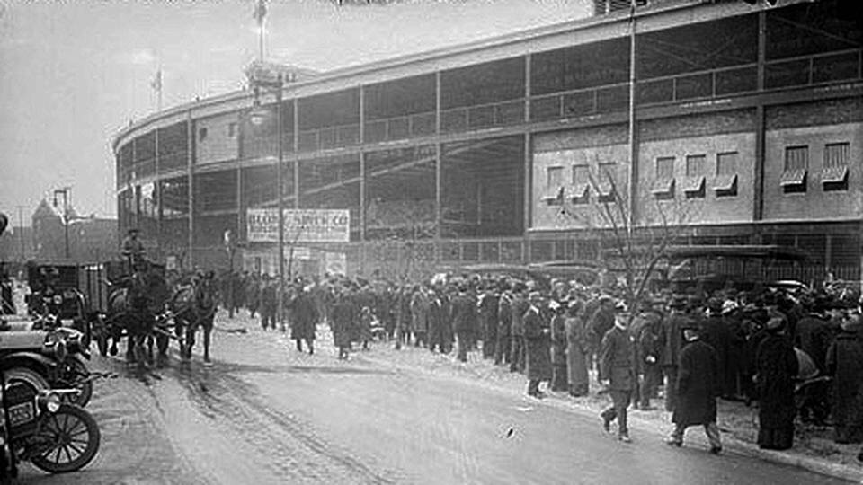 April 23, 1914………Weeghman Park (Wrigley Field), opens for the first time, with the Chicago Federals as the first tenants. The Federals are part of the upstart Federal League, the 3rd Major League. The Federals will remain in Weeghman Park for 2 years, winning the championship in 1915, before the league dissolves, and the Cubs move in, in 1916. The Cubs had been playing in West Side Park. Charley Weeghman owns the Cubs that first year, with William Wrigley also owning a small percentage, and the park remains Weeghman Park until 1920, when it becomes Cubs Park. It remains Cubs Park until 1926, when William Wrigley, the sole owner of the Cubs then, officially names it Wrigley Field. Why was this park built in a more residential section of Chicago and not near a major road? Well because the park, built in 1914, was situated near the Milwaukee Railroad. This is the only remaining Federal League park that still stands. The photos are Weeghman Park, April 23, 1914.