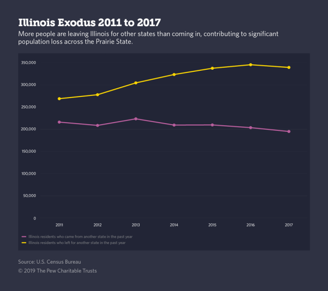 People are leaving Illinois in droves. Republicans blame the state’s high taxes and its unfunded pension liability, which tops $130 billion. Democrats believe it’s the state’s lack of investment in education and infrastructure.
