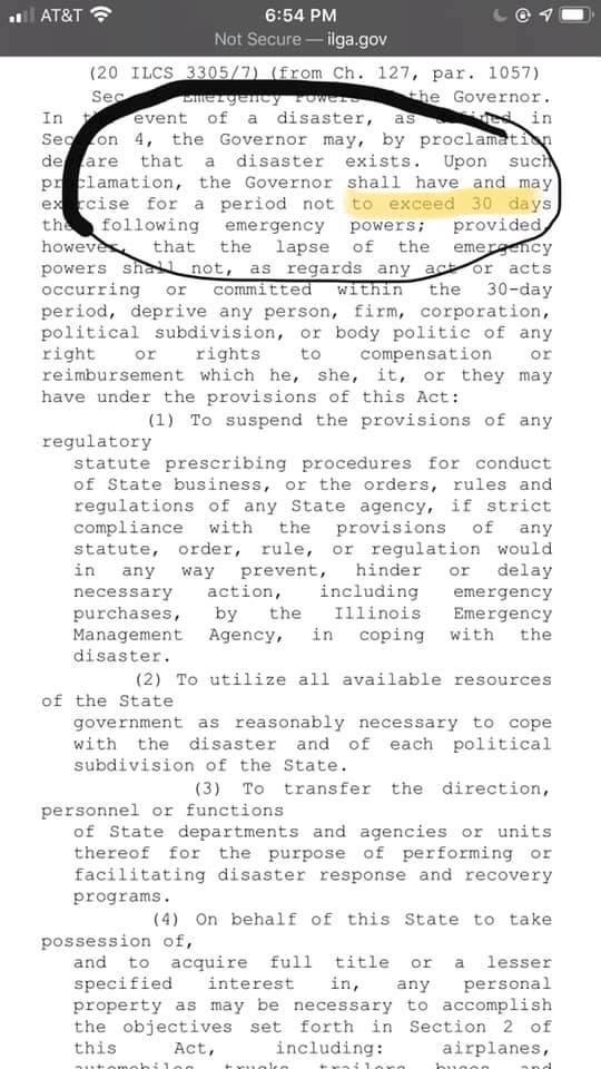 So according to the ILCS the governor has only 30 days after disaster proclamation to exercise specific powers like limiting the movement of people and shutting down businesses. Can someone please explain how our governor is able to even continue a lockdown when his 30 days are already up?