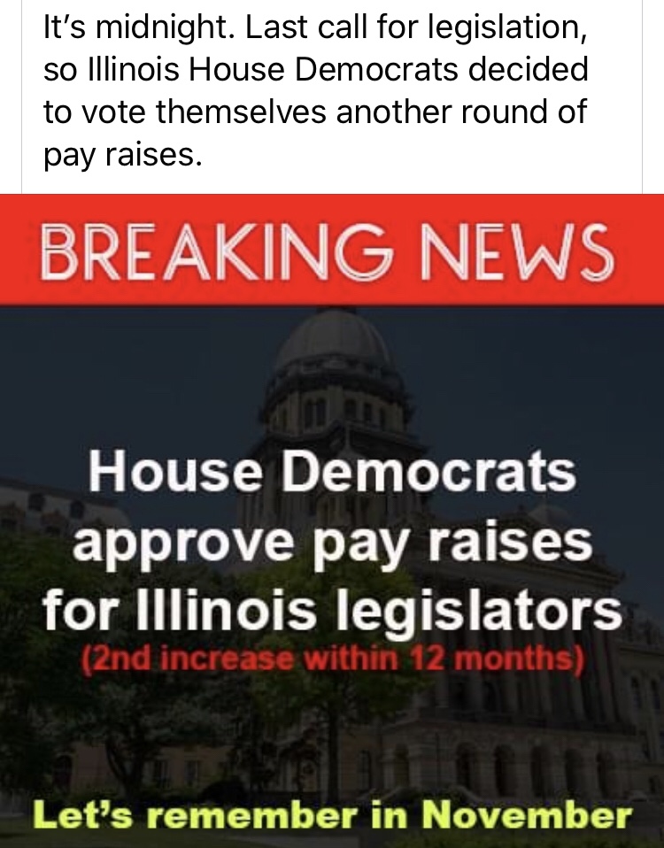 Last night (or this morning) at 1:15 am while you were asleep how did the Illinois Democrats in Springfield address 20% unemployment, families losing their life savings and the financial strain of this pandemic? Did you think they might show empathy and vote to cut their pay (already near the highest in the country) 20% like many people have had to do to keep their jobs in the private sector? If you guessed that you are wrong. For the second time in 12 months the Democrats in Springfield voted themselves a PAY RAISE. Good morning!