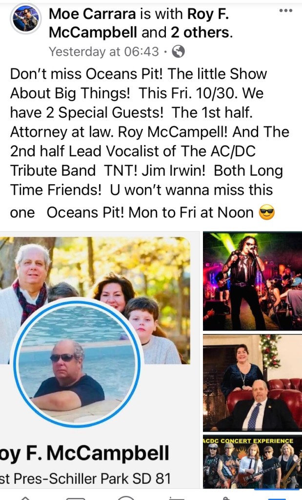 Don’t miss Oceans Pit! The little Show About Big Things! This Fri. 10/30. We have 2 Special Guests! The 1st half. Attorney at law. Roy McCampell! And The 2nd half Lead Vocalist of The AC/DC Tribute Band TNT! Jim Irwin! Both Long Time Friends! U won’t wanna miss this one Oceans Pit! Mon to Fri at Noon 😎