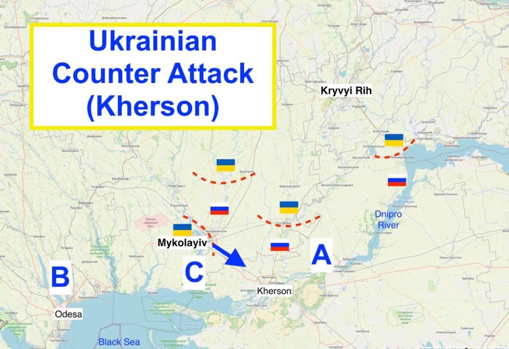 There are preliminary reports of a successful and ongoing Ukrainian counter-offensive near Kherson (A); The only major city the Russians have taken thus far on their only route to the port of Odesa (B) on the Black Sea.