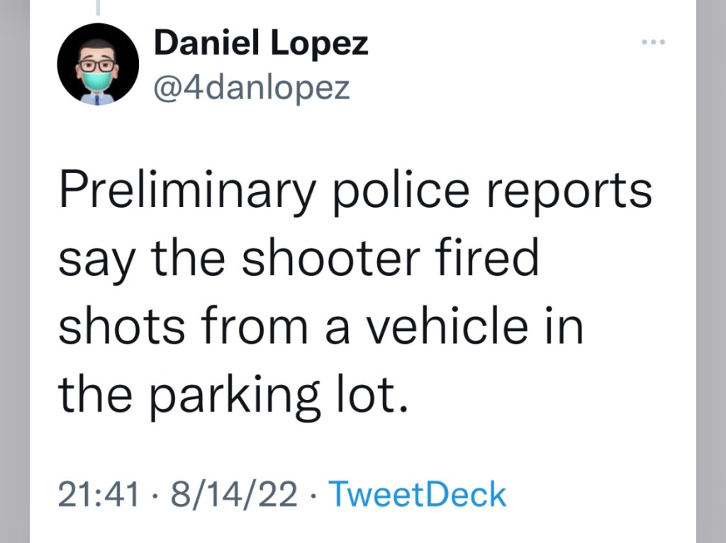 Preliminary police reports say the shooter fired shots from a vehicle in the parking lot.