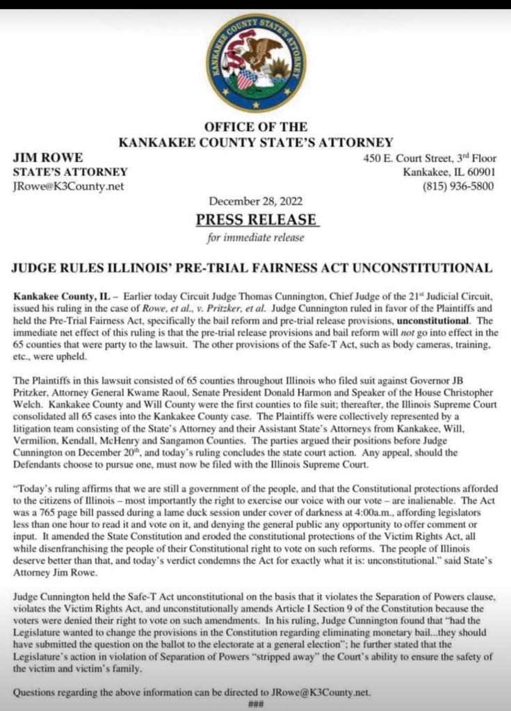 The bail portion of the SAFE T Act was found to be unconstitutional by Judge Cunnington. It’s reported by multiple news outlets that this only will effect counties that filed/joined the lawsuit. An appeal to challenge this ruling would have to be made to the Illinois State Supreme Court.