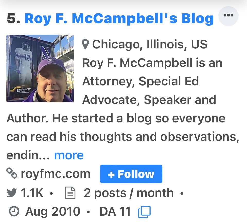 Roy F. McCampbell is an Attorney, Special Ed Advocate, Speaker and Author. He started a blog so everyone can read his thoughts and observations, ending conjecture. Sarcasm and Silliness by a Resident of Leyden Township. This year he was rated number 5 in the top 20