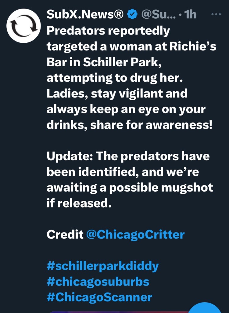 Predator Reportedly Targets a Woman at Richie’s Bar at 9812 Lawrence Avenue in Schiller Park