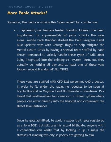 ….apparently our fearless leader, Brandon Johnson, has been hospitalized for approximately 40 panic attacks this year alone. Awhile back Brandon started the CARE Program (Light Blue Sprinter Vans with Chicago flags) to help mitigate the Mental Health Crisis by having a special team staffed by hand chosen personnel to strictly handle these types of calls after being integrated into the existing 911 system. Turns out they actually do nothing all day and at least one of those vans follows around Brandon AT ALL TIMES.
