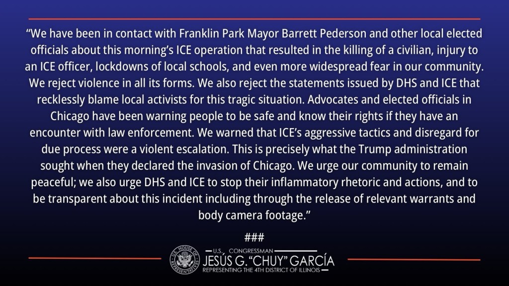 Hours after U.S. Immigration and Customs Enforcement agents fatally shot a man in Franklin Park, U.S. Rep. Jesus “Chuy” Garcia along with Franklin Park Mayor Barrett Pedersen, called for a full investigation at a news conference held in tandem with local officials and immigrant rights leaders.