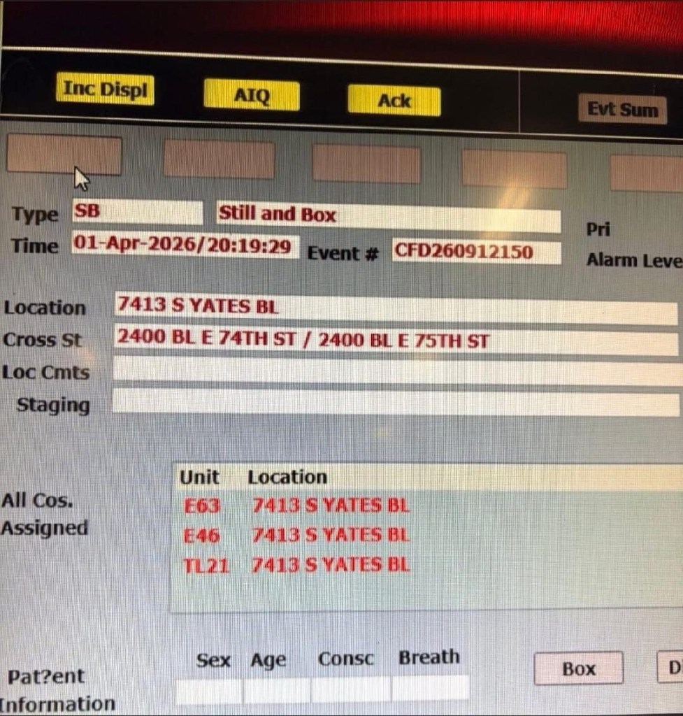 On Monday April 1, 2026, CFD battled a fire at 74th and Yates in South Shore, the Battalion Chief declared an extra alarm and requested a tower ladder.